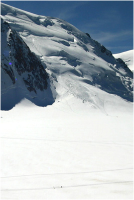Pour donner une idée de l'échelle, les deux points au bas de l'image sont deux alpinistes encordés traversant la Vallée Blanche