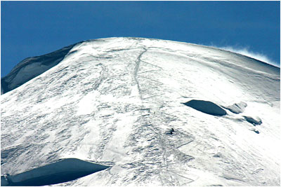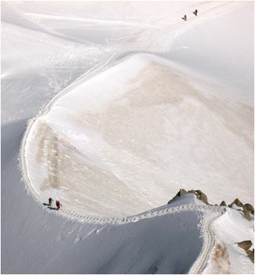 On découvre les traces des alpinistes lors des derniers mètres de l'ascension du Mont Blanc.